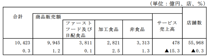 商品別にみるとファーストフードおよび日配食品が3811億円で0.1%増、加工食品が2821億円で2.5%増、非食品が3313億円で1.3%増。売上げの内訳は、商品販売額が9945億円で1.2%増、サービス売上高が478億円で15.3%減少した。