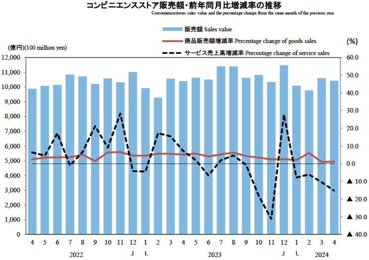 コンビニエンスストアの4月の商品販売額およびサービス売上高は1兆0423億円で、0.3%増加した。
