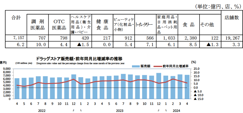 経済産業省大臣官房調査統計グループが発表した「商業動態統計速報」によれば、2024年4月のドラッグストア販売額は7157億円、前年同月比は6.2%増加した。店舗数は1万9267店で前年同月より3.3%増加している。