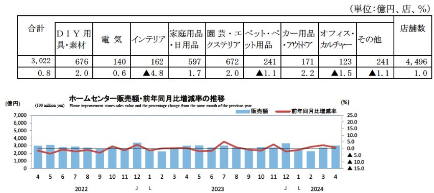 経済産業省大臣官房調査統計グループが発表した「商業動態統計速報」では、2024年4月のホームセンター販売額は3022億円で前年同月比0.8%増加した。店舗数は4496店で前年同月より1.0%増加している。