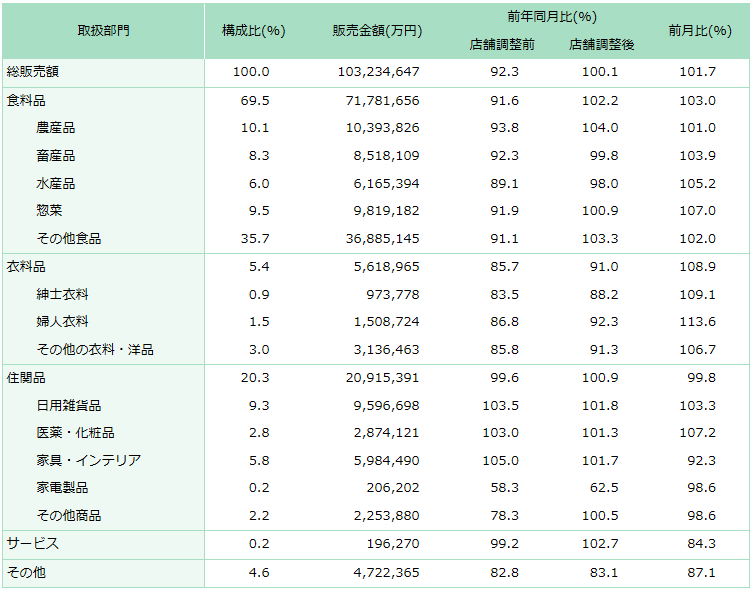 「食料品」の売上高は7178億1656万円で、売上構成比69.5%と約7割を占める。既存店前年同月比は102.2%。節約志向から買上点数減少が続いているが、農産品の相場高騰や店頭価格上昇によって、まずまずの動きだった。