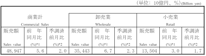 経済産業省大臣官房調査統計グループが毎月の商業動態統計速報を発表する。「商業」とは「小売業」と「卸売業」の総称であり、小売業・卸売業を営む企業と事業所・店舗の事業活動に関する動向を把握することを目的に調査される。