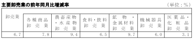 卸売業を業種別にみていく。化学製品卸売業が10.4%増、鉱物・金属材料卸売業が9.7%増、農畜産物・水産物卸売業が9.4%増、衣服・身の回り品卸売業が9.0%増、各種商品卸売業が7.8%増、繊維品卸売業が7.0%増、食料・飲料卸売業が6.5%増、機械器具卸売業が6.0%増、家具・建具・じゅう器卸売業が5.6%増、建築材料卸売業が4.0%の増、医薬品・化粧品卸売業が3.1%増、その他の卸売業が1.3%増となった。全業種でプラスだった。