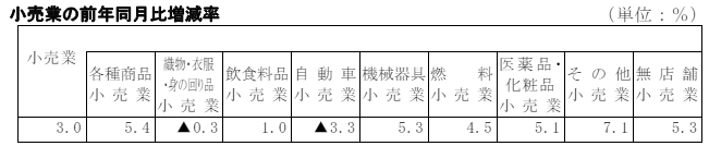 小売業を業種別にみると、その他小売業が7.1%増、各種商品小売業(百貨店など)が5.4%増、機械器具小売業が5.3%増、無店舗小売業が5.3%増、医薬品・化粧品小売業が5.1%増、燃料小売業が4.5%増、飲食料品小売業が1.0%増となった。一方、自動車小売業が3.3%減、織物・衣服・身の回り品小売業が0.3%減となった。