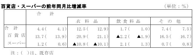 また既存店前年同月比は、百貨店・スーパーが4.1%増、百貨店は13.9%増、スーパーは0.6%増となった。