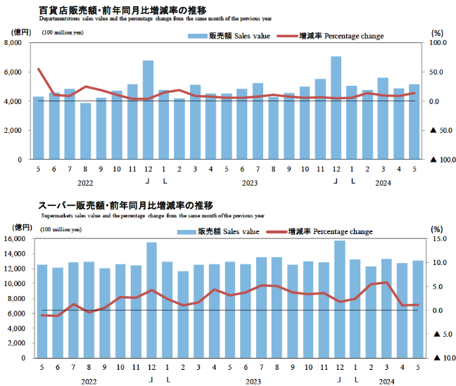 続いては、2024年5月の百貨店・スーパー販売額の動向を見る。百貨店・スーパー販売額は1兆8211億円、4.4%増加した。百貨店は5149億円で13.7%増、スーパーは1兆3062億円で1.2%増だった。商品別にみると、衣料品は12.5%増、飲食料品は1.7%増、その他は