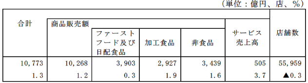 商品別では、ファーストフードおよび日配食品が3903億円で0.3%増、加工食品が2927億円で1.9%増、非食品が3439億円で1.6%増。売上げの内訳は、商品販売額が1兆0268億円で1.2%増、サービス売上高が505億円で3.7%増加した。