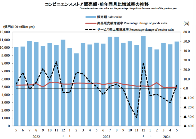 コンビニエンスストアの5月の商品販売額およびサービス売上高は1兆0773億円で、1.3%増加した。店舗数は5万5959店で0.3%減っている。