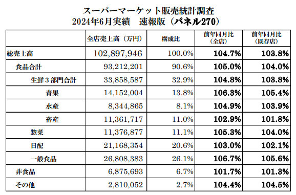 一般社団法人日本スーパーマーケット協会(JSA)、オール日本スーパーマーケット協会(AJS)、一般社団法人全国スーパーマーケット協会(NSAJ)の3団体が、2024年6月の販売実績を発表した。6月は3団体会員企業のうち、パネル270社の8370店舗を集計している。