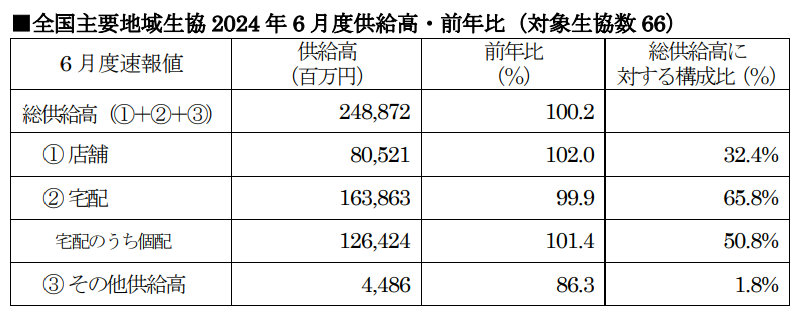日本生活協同組合連合会(東京都渋谷区、土屋敏夫代表理事会長)が、2024年6月度の供給状況(売上高)を発表した。全国66生協の実績をまとめている。