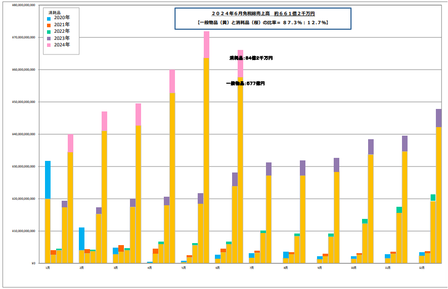 6月の免税総売上高は約661億2000万円で、前年同月比135.5%増。27カ月連続のプラスだ。前月(2024年5月)に記録した過去最高の718億円に次ぎ、調査開始以来2番目に高い数値だった。