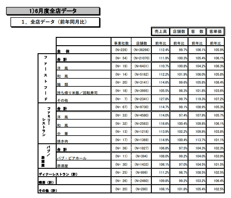 6月外食統計|全店売上高12.4%増/人出増加で外食全体好調