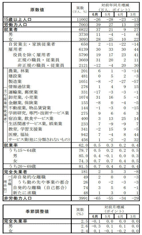 6月労働力調査|就業者数6822万人/卸・小売業の就業者は前年より31万人増