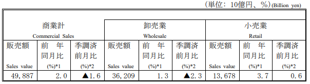 具体的には商業販売額の動向として、卸売業販売額と小売業販売額の動向、そして業態別の販売額の動向として百貨店・スーパー販売額、コンビニエンスストア、家電大型専門店、ドラッグストア、ホームセンターの統計数値が発表される。
