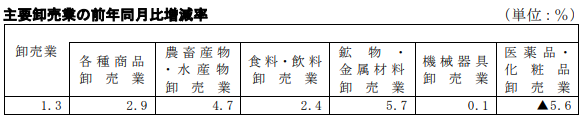 卸売業を業種別にみると、鉱物・金属材料卸売業が5.7%増、農畜産物・水産物卸売業が4.7%増、化学製品卸売業が3.0%増、各種商品卸売業が2.9%増、食料・飲料卸売業が2.4%増、衣服・身の回り品卸売業が0.5%増、その他の卸売業が0.5%増、機械器具卸売業が0.1%増となった。