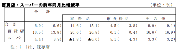 また既存店ベースでは、百貨店・スーパーが6.6%増。百貨店は13.8%増、スーパーは3.9%増となった。