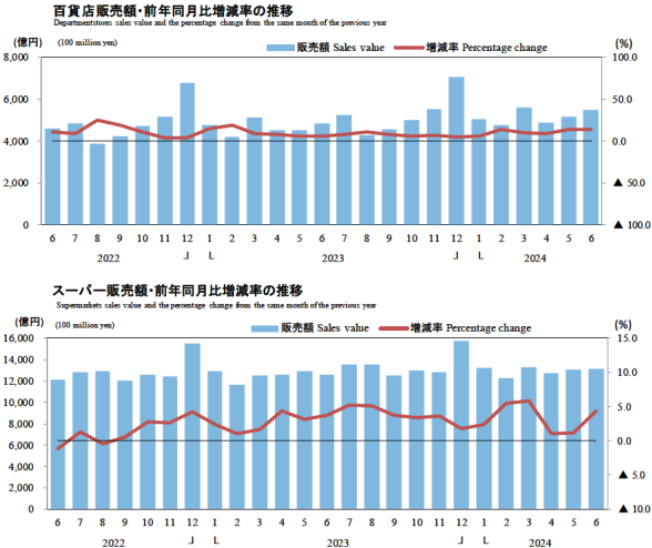 百貨店・スーパー販売額は1兆8674億円で、前年同月比6.9%増だった。百貨店は5495億円、13.5%増、スーパーは1兆3179億円で4.4%増加した。商品別では、衣料品が14.6%増、飲食料品が4.5%増、その他が9.0%増となった。