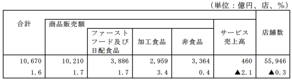 商品別では、商品販売額が1兆0210億円で1.7%増。この内訳は、ファーストフードおよび日配食品が3886億円で1.7%増、加工食品が2959億円で3.4%増、非食品が3364億円で0.4%増。そしてサービス売上高は460億円で2.1%減となった。