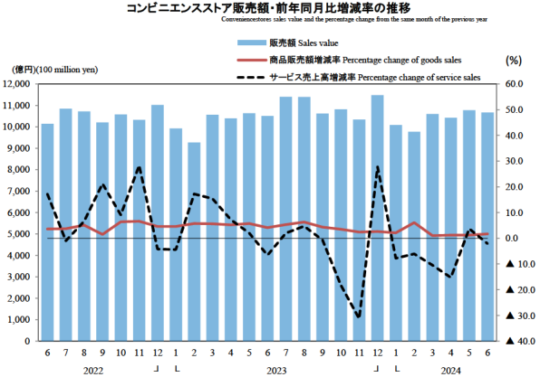 コンビニエンスストアの商品販売額およびサービス売上高は1兆0670億円で、1.6%増加した。店舗数は5万5946店で0.3%の減少。