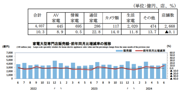 家電大型専門店の6月の販売額は4037億円、前年同月比10.3%増加した。店舗数は2668店で0.1%減少している。