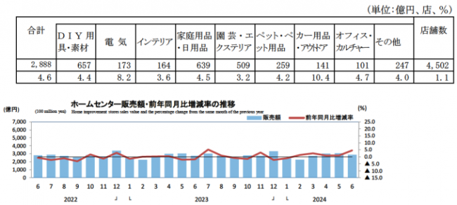6月のホームセンター販売額は2888億円で前年同月比4.6%増加した。店舗数は4502店で、前年同月より1.1%増加した。