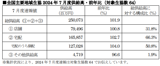 日本生活協同組合連合会(東京都渋谷区、土屋敏夫代表理事会長)が、2024年7月度の供給状況(売上高)を発表した。全国64生協の実績をまとめたもの。総供給高は2500億7300万円。前年同月比は101.9%で、11カ月連続のクリア。