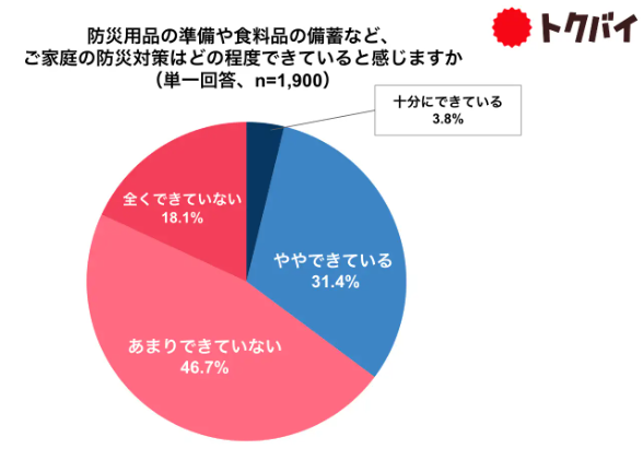 家庭での防災対策がどの程度できていると感じるかたずねたところ、「あまりできていない」46.7%、「全くできていない」18.1%を合わせた6割以上が「できていないと感じる」と回答。