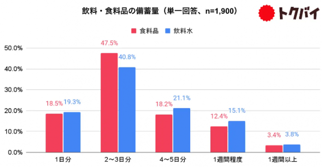 食料品と飲料水の備蓄量については、食料品では47.5%、飲料水では40.8%の人が2〜3日分を備蓄、4〜5日分以上の中期的な備蓄を行っている家庭もそれぞれ約4割という結果となった。農林水産省によると家庭用の食料品の備蓄は「最低でも3日分、出来れば1週間分程度の備蓄に取り組むことが望ましい」とされており、3日程度を基準に備えを行っている家庭が多いことがうかがえる。