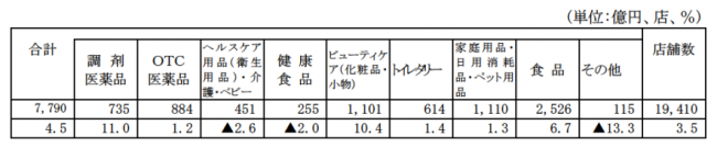 ドラッグストア販売額は7790億円、前年同月比は4.5%増加した。店舗数は1万9410店で前年同月より3.5%増加した。