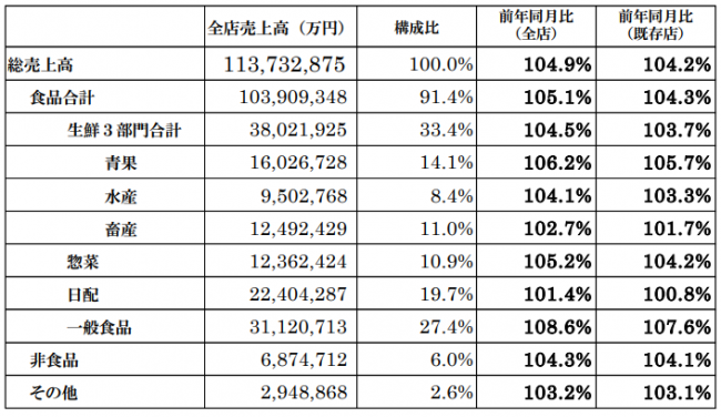 総売上高は1兆1373億2875万円で、前年同月比は既存店で4.2%増、全店で4.9%増だった。2023年2月以降、18カ月連続増だ。