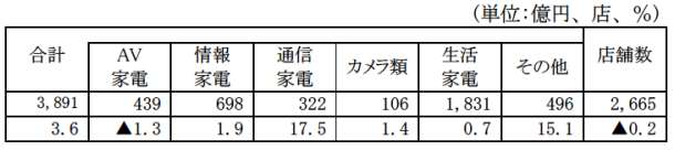 家電大型専門店の販売額は3891億円、前年同月比3.6%増加した。店舗数は2665店で0.2%減少した。