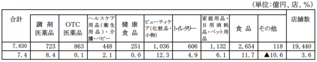 ドラッグストア販売額は7830億円、前年同月比は7.4%増加した。店舗数は1万9440店で前年同月比3.6%増。