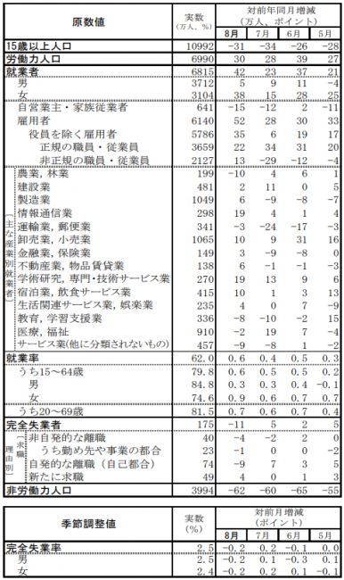 8月労働力調査|就業者数6815万人/卸・小売業の就業者数1065万人