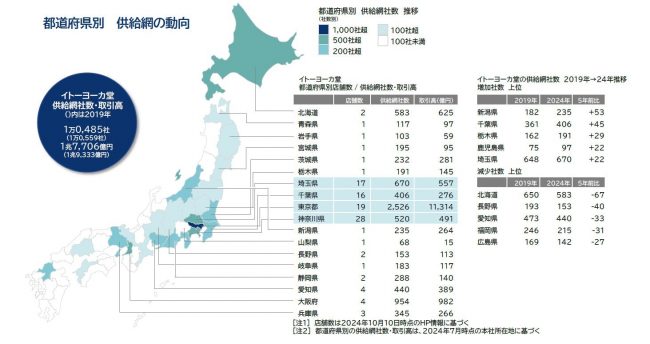 社数で最も多いのは「東京都」の 2526 社、取引高は 1 兆 1314 億円に上った。埼玉県・千葉県・神奈川県を含めた首都圏エリアで、社数ベースで約 4 割、取引高では約 7割を占め、イトーヨーカ堂の供給網は首都圏に本社を置く企業を中心に構成されている。2019年と比較すると、都道府県別に社数で「減少」が 28、「増加」が 16 となった。