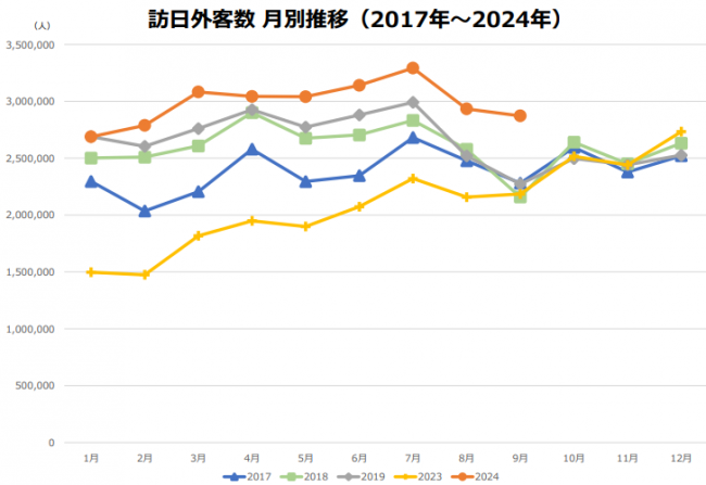 日本政府観光局(JNTO)が発表した9月の訪⽇外客数は287万2200人で、前年同月比は31.5%増、2019年同月比では26.4%増だった。8カ月連続で同月過去最高を記録している。