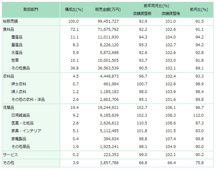 部門別では、「食料品」が売上高7167億5792万円で、既存店102.6%。食品部門の売上構成比は72.1%で7割を超えている。「住関品」は売上高1924億4921万円で106.1%、「衣料品」は444億9873万円で102.4%。「サービス」は売上高22億3353万円で102.1%だった。