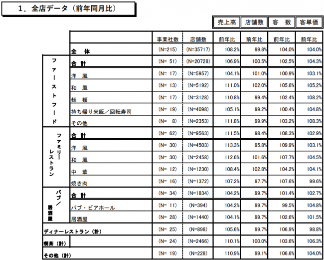 9月の外食全体の売上げは前年比108.2%、店舗数は99.8%、客数104.0%、客単価は104.0%と好調だった。