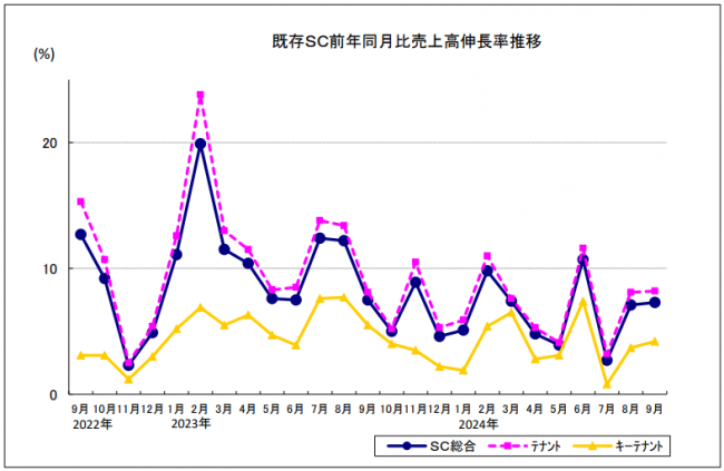 (一社)日本ショッピングセンター協会(東京都文京区、清野智会長)が2024年9月の「SC販売統計調査」を発表した。調査対象は509ショッピングセンター(SC)。