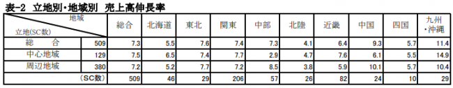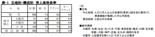 立地別にみると、中心地域は総合で7.5%増、周辺地域は総合で7.2%増となった。インバウンド客に加え、3連休で国内旅行客の来館が増えたことで、立地を問わず売上げにつながったSCが多かった。