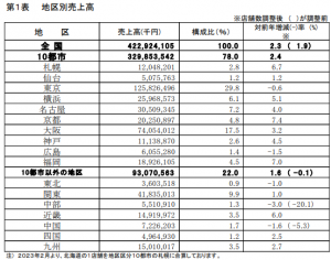 地区別(10都市以外の7地区)では、4地区で対前年増となり、3カ月ぶりにプラス転換した。近畿はインバウンド効果などから 6.0%増と伸長した。