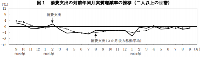 9月の消費支出は、2人以上の世帯では28万7963円で、前年同月比は物価変動の影響を除いた実質では1.1%減少、名目では1.8%増加した。前月比(季節調整値)では、実質1.3%減少した。
