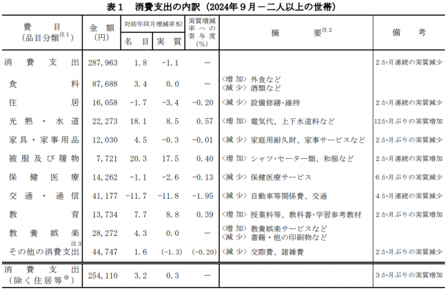 9月家計調査|2人以上世帯消費支出は28.8万円/実質1.1%減・名目1.8%増
