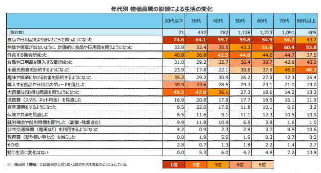 その一方で、50~80代以上の中・高齢層では、「食品や日用品の購入量が減った」「水道光熱費を節約するようになった」と、購入する商品の量自体を減らす方法で節約に対応する傾向がみられた。
