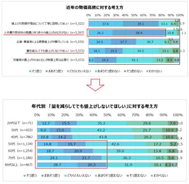 「量を減らしても値上げしないでほしい」の設問に対しては、年代が上がるほど「そう思う」「まあそう思う」と回答する割合が高い傾向が出た。20代以下から40代までは「そう思わない」「まあそう思わない」などの回答が多いのに対し、50代以上では肯定的な回答が多かった。