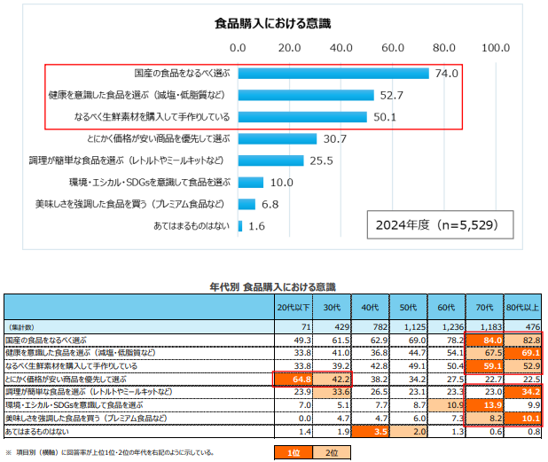 食品購入の意識について、「国産の食品をなるべく選ぶ」(74.0%)、「健康を意識した食品を選ぶ」(52.7%)、「なるべく生鮮素材を購入して手作りしている」(50.1%)という回答率が高かった。年代別では、「とにかく価格が安い商品を優先して選ぶ」という意識は若年層で回答率が高いが、その他の意識している項目は高齢層ほど、回答率が高い傾向が出た。