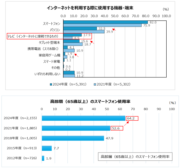 インターネット利用時の使用機器・端末は、インターネット接続が可能な「テレビ」の使用率が前回実施時(2021年度)8.9%から17.9%に増加。「スマートフォン」が75.9%から82.0%に増加した一方で、「パソコン」「タブレット」「家庭用ゲーム機」は使用率が減少した。65歳以上の高齢層に絞って経年比較すると、「スマートフォン」の使用率は52.6%から64.2%と伸長した。「スマートフォン」を介したインターネット利用は高齢層でも一般的になっている。