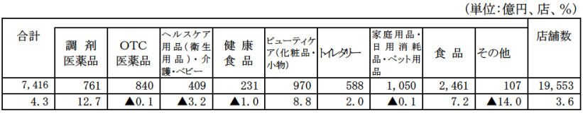 ドラッグストア販売額は7416億円、前年同月比は4.3%増加した。店舗数は1万9553店で前年同月比3.6%増。