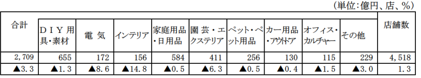 商品別では全カテゴリーでマイナスとなった。インテリアが14.8%減、電気が8.6%減、園芸・エクステリアが6.3%減、その他が3.0%減、オフィス・カルチャーが1.5%減、DIY用具・素材が1.3%減、家庭用品・日用品が0.5%減、ペット・ペット用品が0.5%減、カー用品・アウトドアが0.4%減だった。