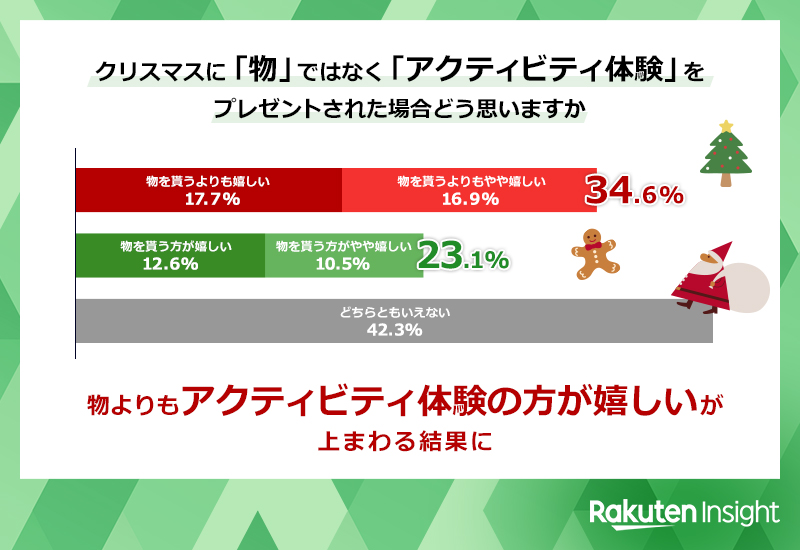 物ではなく、旅行や食事などのアクティビティ体験をクリスマスギフトとして贈られた場合、どう思うかを聞いたところ、「物よりも嬉しい」34.6%だった。また、「物の方が嬉しい」は23.1%で、「物の方が嬉しい」より「物よりも嬉しい」の方が11ポイント以上高かった。年代別でみると、20代から40代の「物よりも嬉しい」が3割代前半であるのに対し、50代から60代は3割代後半と、高年齢層の方が若年層よりもアクティビティ体験を求める傾向がみられた。