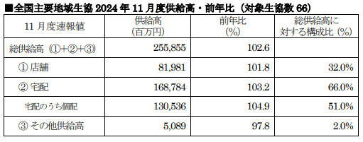 日本生活協同組合連合会(東京都渋谷区、土屋敏夫代表理事会長)が、2024年11月度の供給状況(売上高)を発表した。全国の66主要生協の実績をまとめたもの。
